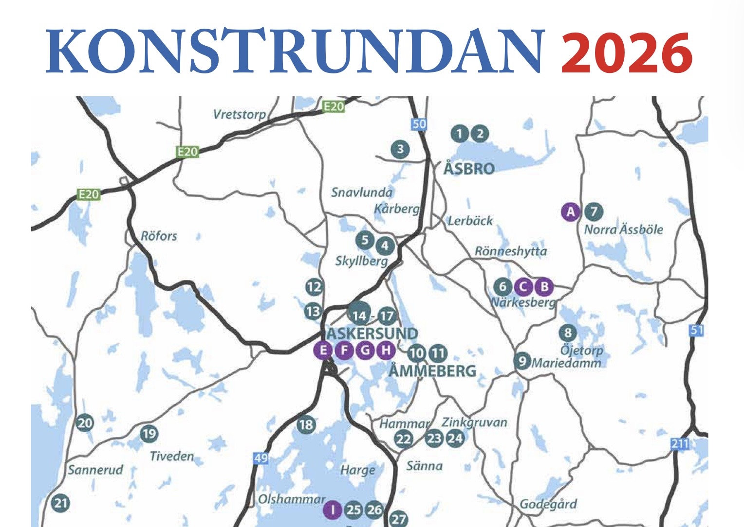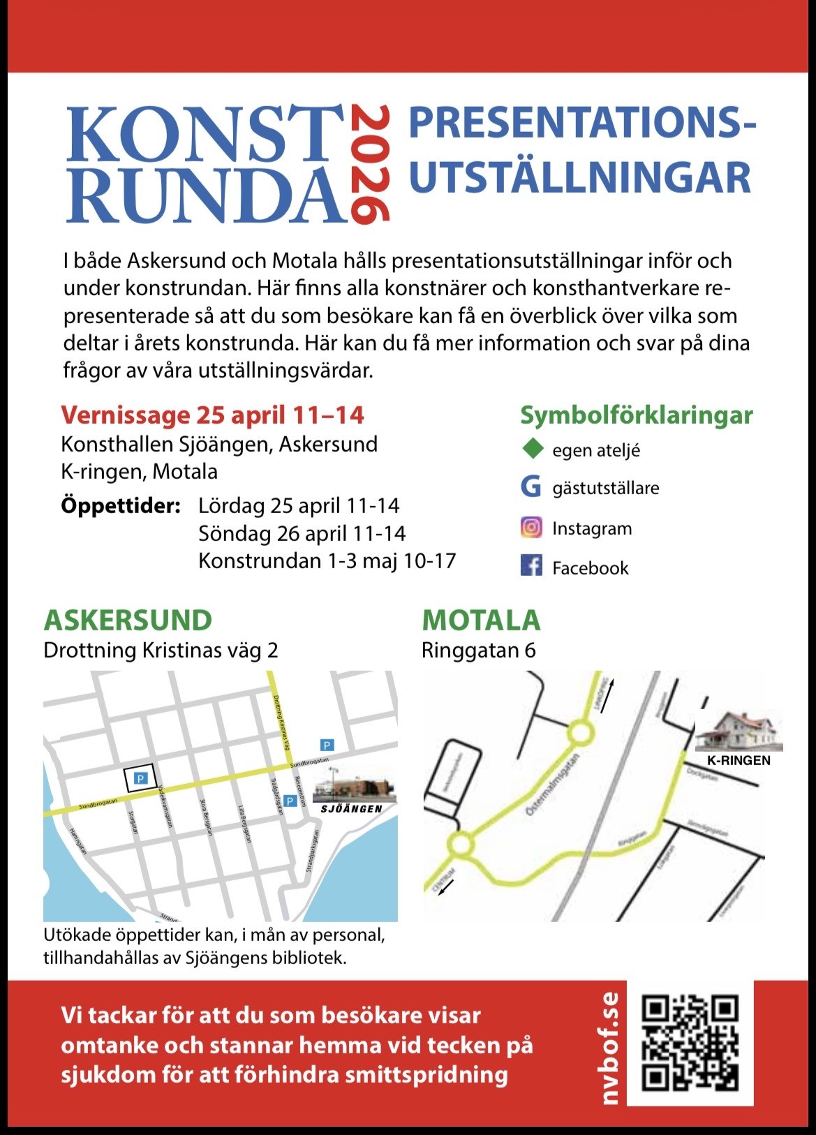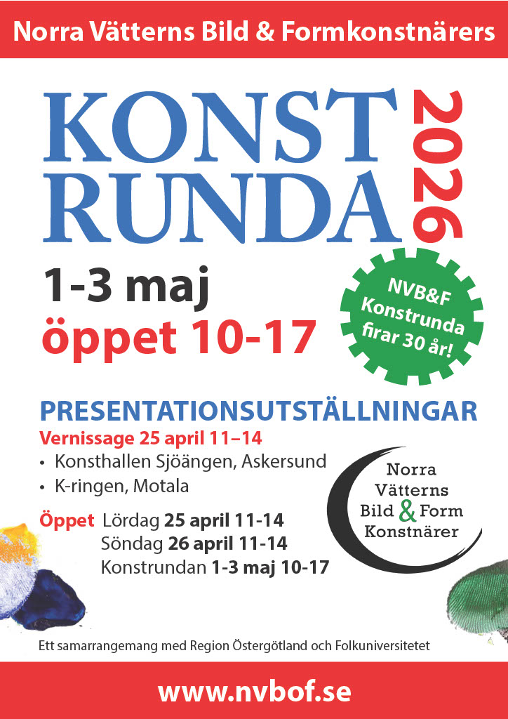 Wir sind etwa 140 Mitglieder, berufsmässige Künstler und auch welche die nicht hauptsächlich mit der Kunst arbeiten.. Weitere information finden Sie auf www.nvbof.se und www.facebook.com/NVBoF.Konstrunda. Jede Frühling, rund 1. Mai, arrangieren wir Konstrundan, wenn Ateliers und Werkstätte offen sind. In Askersund und in Motala könen Sie in den Kunsthällen ein gutes Über- blick über den Teilnehmern und deren Kunstwerke bekommen und dann eine eigene ”Runde” durch der schöne Landschaft machen und die verschiedene Ausstellungen besuchen.